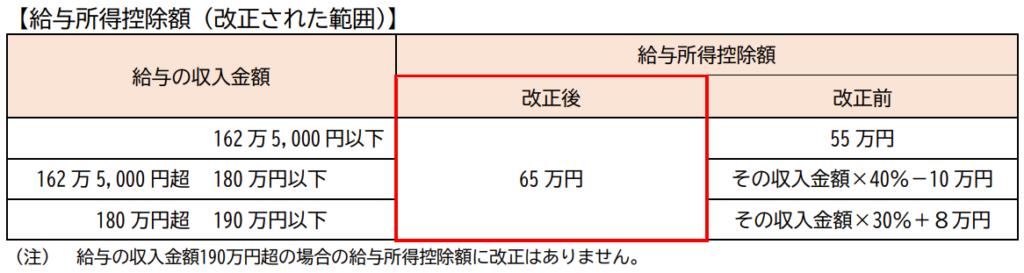 物価上昇及び就業調整への対応として、給与所得控除の最低保証額が55万円から65万円に引き上げられました。